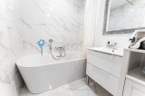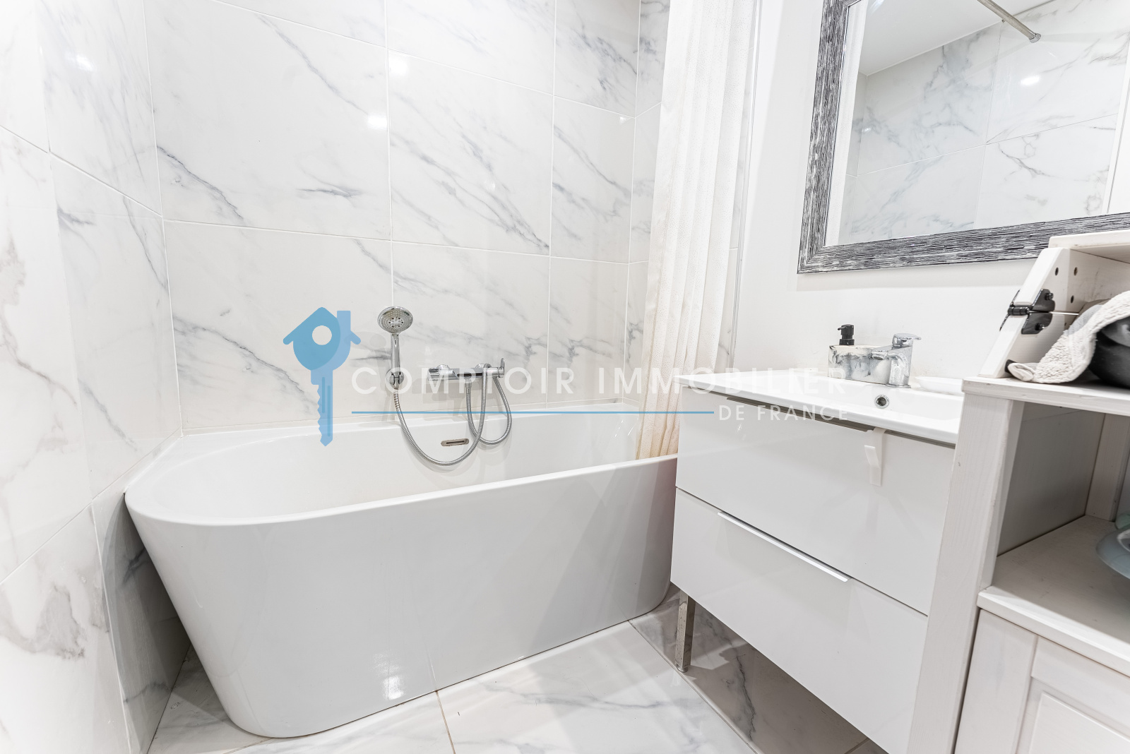 -Une salle de bains avec baignoire, pratique et confortable,