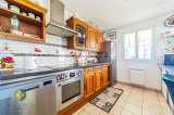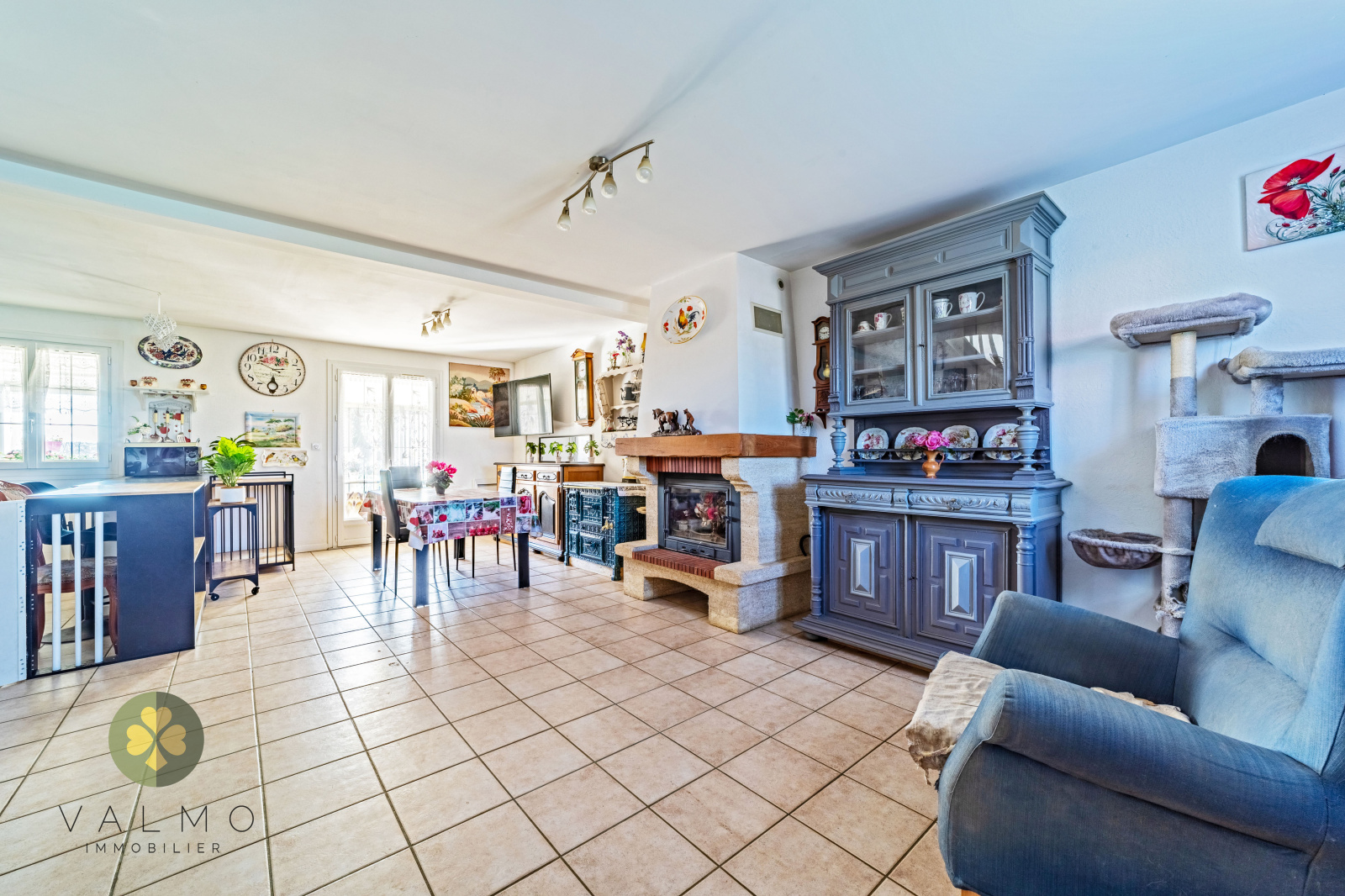 Cuisine ouverte sur un grand salon / séjour avec cheminée
