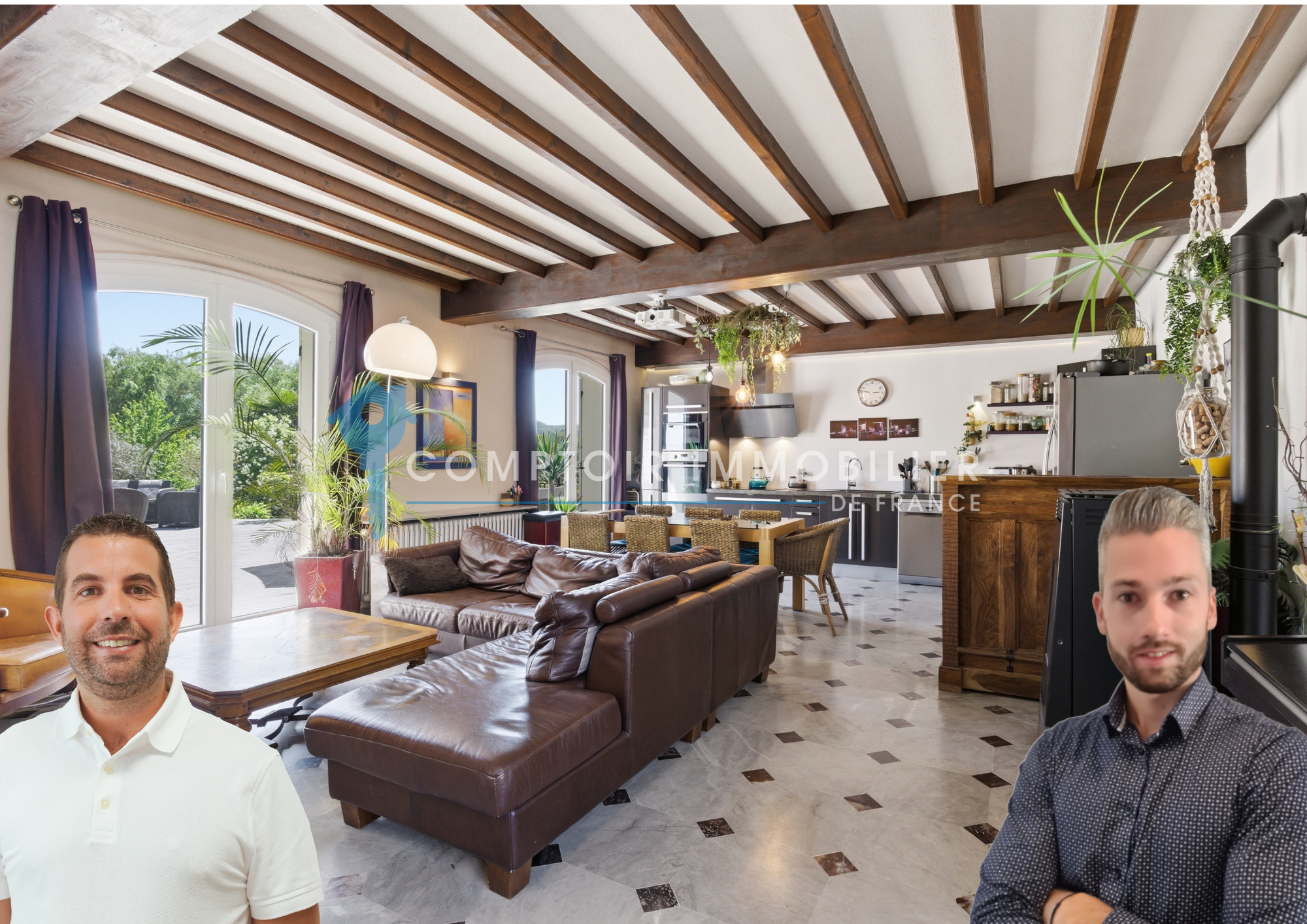 Au 1er étage : cuisine ouverte sur le séjour / salle à manger totalisant près de 50 m² et donnant sur la terrasse de 70 m², 5 chambres de 9 à 12 m² dont une suite parentale de 16 m² avec salle d’eau et dressing, une salle de bains de 7 m² et un WC séparé.
